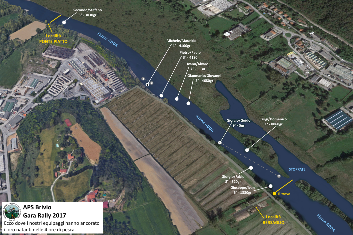 Brivio, Domenica 01 Ottobre 2017. Dal Bersaglio al Ponte Piatto Sin dalla prima edizione, questa bellissima competizione ha sempre visto il suo svolgimento tra l'ultima settimana di Ottobre e la prima di Novembre. Questo periodo fino a una decina di anni fa era molto proficuo in termini di pescato, in quanto era molto raro terminare le tre ore di gara senza un pesce in nassa e qualche chilo di pescato all'attivo. Purtroppo i bei tempi di una volta sono solo un nostalgico ricordo, visto che di pesci nelle acque del nostro bellissimo Fiume Adda ce ne sono ormai sempre meno, anche se negli ultimi due anni si è visto con soddisfazione il ritorno di numerosi branchi di Pighetti, Scardole di buona taglia, Codarossa e Triotti. Per non parlare dell'aumento considerevole di Persici. Capitolo a parte per quanto riguarda l'aumento massiccio di Carpe e Barbi, pesci che solo cinque anni fa si prendevano di rado. Fervono i preparativi alla Frazione Toffo Sta di fatto che ormai da una decina di anni a questa parte, anno dopo anno il pescato si è fatto sempre più esiguo e le Gare Rally terminate con numerosi cappotti sempre più frequenti. Ultimamente solo la fortuna di azzeccare il sito di pesca giusto, determinava la vittoria o la sconfitta. Poste di pesca un tempo ricche di pesce, che se raggiunte per primi remando di buona lena, erano garanzia di successo, ad oggi sono diventate un terno all'otto. Per dare un pò di freschezza e cercare di riportare un pò di pesce in nassa, quest'anno si è deciso di rompere con la tradizione e spostare la gara a fine Settembre, inizio Ottobre, con la speranza che con un clima più mite e la temperatura più calda dell'acqua, il pesce fosse più attivo e propenso ad abboccare ai nostri ami. A mio parere se avessimo scelto anche la prima settimana di Settembre non sarebbe stata un'eresia. Comunque, vediamo com'è andata. Che meraviglia il nostro fiume Ritorno alle origini per quanto riguarda il punto da dove far partire la gara, riportato in località Bersaglio, tratto di fiume sito a monte del paese a circa 700 metri dalla Bella Venezia. Dato che nelle edizioni passate la scelta del lato campo gara, "pescare a monte o pescare a valle", è risultata alquanto tribolata, causa i diversi punti di vista che vedevano a confronto chi preferiva "sempre a valle, chi sempre a monte e chi una volta in su e una volta in giù", quest'anno si è deciso di tornare alle vecchie maniere, e per decidere quale tratto di fiume avrebbe fatto da cornice alla manifestazione si è deciso di rispolverare il lancio della "vecchia e cara monetina". Raduno fissato alle sette e trenta. Alle sette e un quarto tutti gli equipaggi si sono fatti trovare belli pimpanti al via. Quindi tutti pronti, mancava solo il sorteggio per decidere dove pescare. Non essendoci più le vecchie "100 Lire", l'affermazione "testa o croce" ha generato al momento del sorteggio un attimo di caos!! Vediamo quindi minuto per minuto come sono andate le cose. Dude ha preso la moneta e con il suo potente vocione ha esclamato "Testa a Valle , Croce a Monte". Lanciati i "2 EURO" sulla barca di Giorgio e Guido, si è verificato subito il primo inconveniente, in quanto la moneta infida è andata ad infilarsi sotto le assi del pianale della barca, impedendo di vedere cosa la sorte avesse scelto!! Tutto da rifare quindi !!. Paolo dalla sua barca ha allungato la mano, sollevato l'asse e recuperato la moneta. Per curiosità ha guardato cos'era uscito ed ha esclamato: "Quì è uscita l'Aquila, non c'è ne Testa ne Croce !! Quindi a cosa corrisponde ?". Subito Dude ha preso la parola dicendo "Si Si, corrisponde a testa. Si va a valle". Alchè Guido non convinto della cosa, con il suo solito aplomb inglese che lo contraddistingue ha esclamato "Ma che testa e testa (giù una serie di imprecazioni alla sua maniera), l'aquila è l'aquila! altro che testa. Qui a me la moneta che rifacciamo il sorteggio!". Malauguratamente i "2 Euro erano Tedeschi", e della testa di Dante nemmeno l'ombra. Dopo aver assegnato al lato della moneta avente l'effige dell'Aquila il campo gara "a valle del raduno", finalmente si è potuto effettuare serenamente il sorteggio. Guido ha rilanciato la moneta e dopo un attimo di suspense....alla fine il verdetto! "E' uscito il lato con inciso 2 EURO !! Si va a monte !". A colpi di remi si raggiunge il ritrovo Dopo un attimo di perplessità e le consultazioni del caso per decidere dove andare ad ancorare la barca, tutti hanno portato i proprio natanti in linea per il via. Alle sette e trenta in punto, LO START ! A colpi di remi, dopo circa 20 minuti quasi tutti gli equipaggi erano già sul posto prescelto, con l'ancora gettata nella cristallina acqua dell'Adda, pronti a pescare. Vediamo come si sono distribuiti gli equipaggi sul campo gara (vedere foto piantina campo gara). Solo Stefano e Secondo hanno deciso di spingersi fino al limite massimo del campo prescelto, sito in località Ponte Piatto. Maurizio e Michele si sono fermati davanti alla stradina della Delna spostati sulla sponda Briviese, Pietro e Paolo 150 metri sotto, sempre sulla stessa sponda. Subito sotto, a circa 100 metri, Ivano e Alvaro, ancorati in centro al fiume. Altri 100 metri a valle, lato sponda Bergamasca, si sono ancorati Dude e Giovanni. In zona Bersaglio si sono fermati Luigi e Domenico che hanno gettato l'ancora davanti al canaletto che porta acqua nelle stoppate. Giorgio Rucco e Guido 200 metri a monte del canaletto, sponda Briviese, Fabio e Giorgio Riva 300 metri a monte del via, sponda Briviese e a chiudere Giuseppe e Ivan proprio ad inizio campo gara stessa sponda. Campo Gara a Monte del raduno, sito in località Bersaglio Per tutta la gara le posizioni si sono mantenute stabili, in quanto solo Giorgio Rucco e Guido ad un ora dalla fine hanno cambiato drasticamente posta di pesca, andando ad ancorarsi in prossimità dell'imboccatura delle stoppate. Per Michele e Maurizio solo dei piccoli spostamenti tattici per affinare la posizione. V